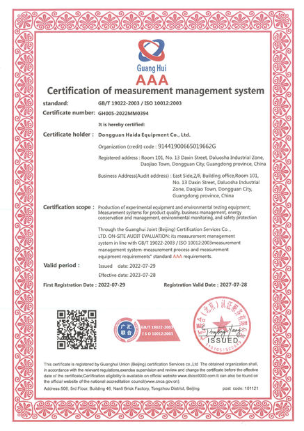 Haida założona w 2004 roku w mieście Dongguan, gdzie znajduje się "dolina krzemowa" światowego przemysłu produkcyjnego.produkcja, sprzedaż, kalibracja i obsługa posprzedażna sprzętu do badań, takich jak sprzęt do badań papieru i opakowań, sprzęt do badań mebli, sprzęt do badań mechaniki materiałów, sprzęt pomiarowy optyczny,sprzęt do badań niezawodności środowiskowej itp.Dzięki wytrwałym wysiłkom wszystkich pracowników, Haida posiadała 4 fabryki o łącznej powierzchni 60 000 metrów kwadratowych, 15 biur oddziałów obejmujących południowy Chiny, północny Chiny, wschodnie Chiny, środkowe Chiny i północno-zachodnie Chiny,Ponadto ponad 20 zagranicznych serwisów posprzedażowych obejmuje Azję Południowo-Wschodnią., Europy, Ameryki Północnej i Bliskiego Wschodu z ponad 28 000 klientami.