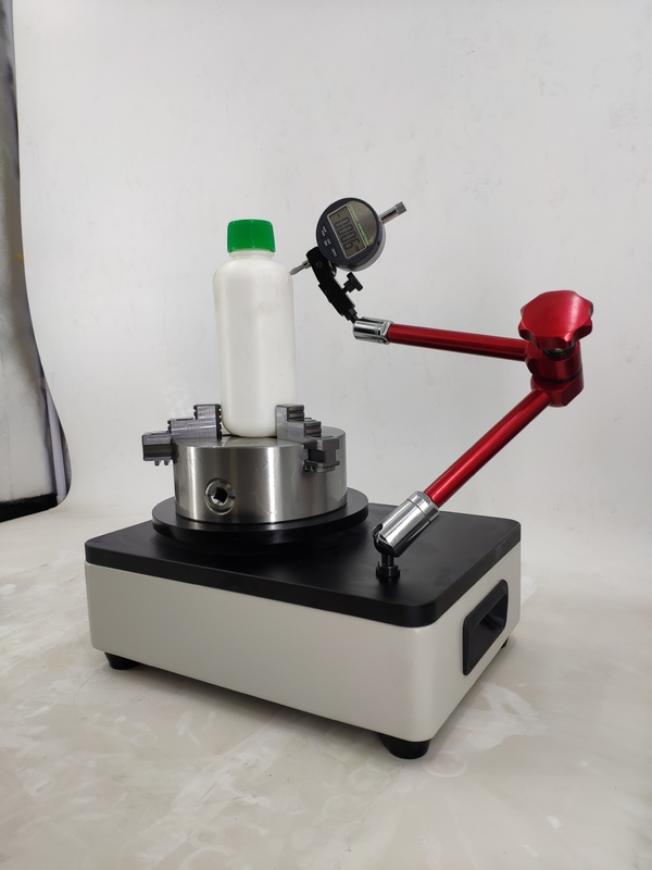 The bottle bottom is fixed on the rotating disk of the horizontal plate, with the bottle mouth contacting the micrometer. Rotating 360° reveals maximum and minimum values, with 1/2 of their difference being the vertical axis deviation value.